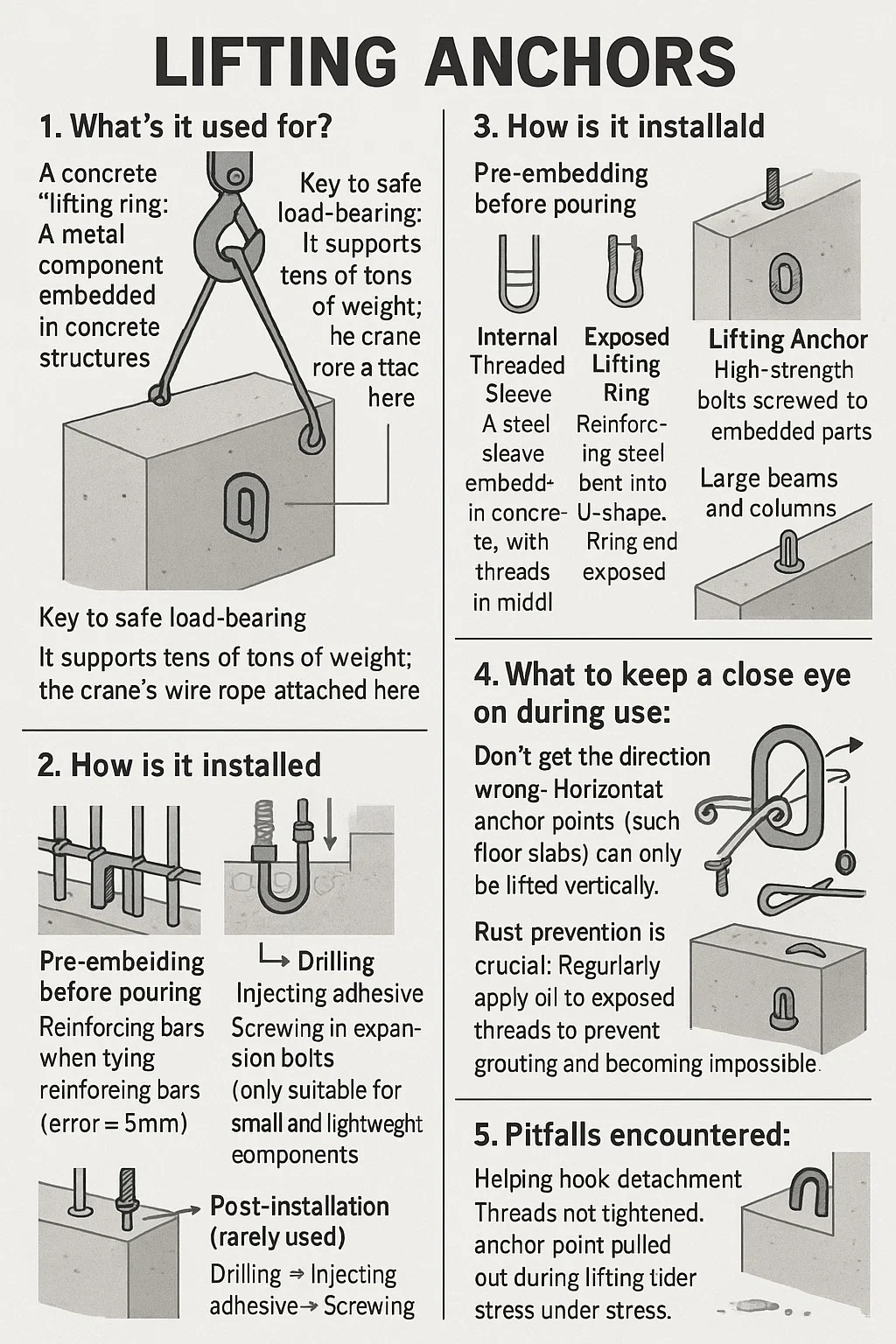 Pré-incorporação antes de despejar: ① Fixe a posição do ponto de ancoragem ao amarrar barras de reforço (erro ≤ 5mm) ② Solde mangas/anéis em U às barras de reforço principais para evitar deslocamento ③ Evite pontos de ancoragem durante a vibração do concreto para evitar rejuntamento