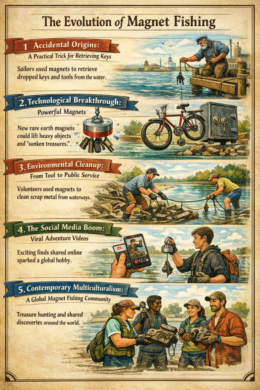Não existe um momento histórico preciso para a invenção da pesca magnética, como a invenção da lâmpada. Em vez disso, evoluiu gradualmente de um hack prático para um hobby ao ar livre mundialmente popular.