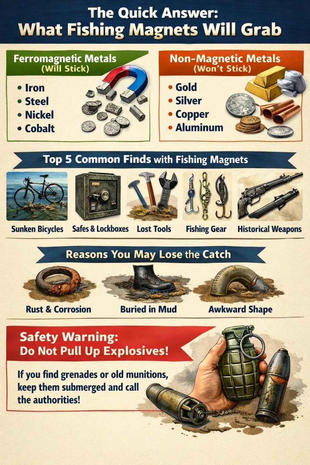 Enquanto ímãs de pesca são ferramentas de descoberta, eles também podem encontrar perigo. Em muitas partes da Europa e em algumas partes dos EUA, engenhos não detonados (UXO), como granadas ou morteiros antigos, podem ser recolhidos. Esses itens ainda podem estar ativos e extremamente perigosos. Se você vir algo que pareça um explosivo, não toque nele , mantenha-o submerso, se possível, e chame o esquadrão antibombas imediatamente.