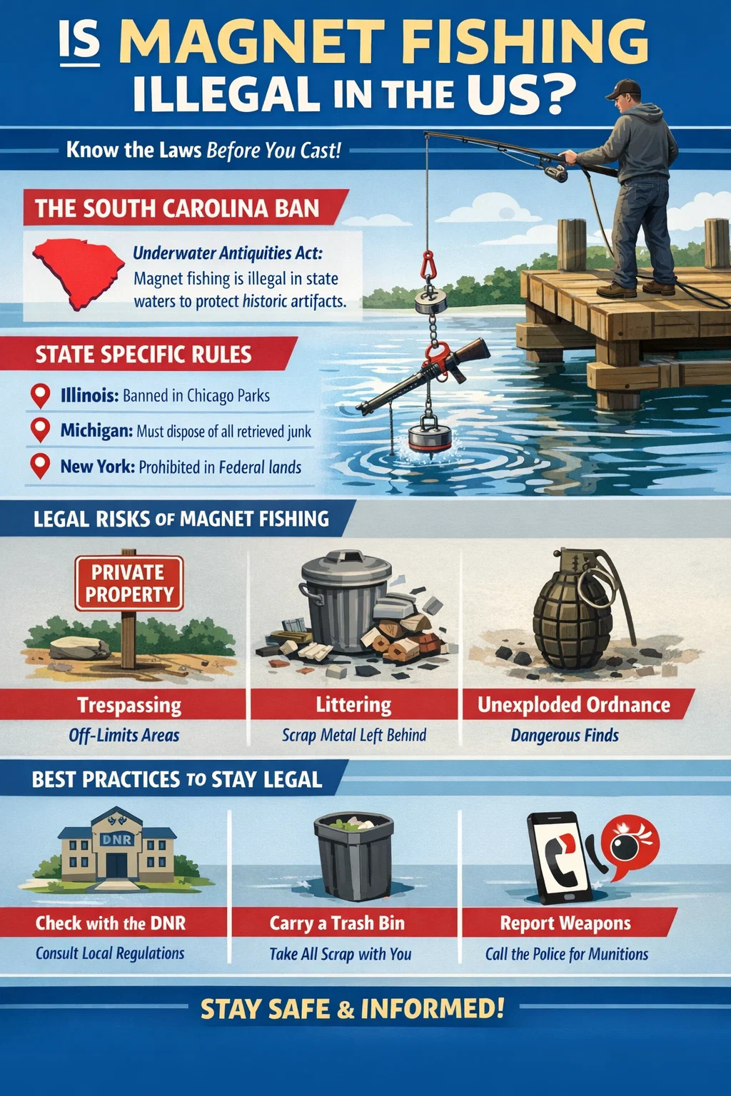 A pesca magnética é não é ilegal em nível federal nos Estados Unidos, mas é estritamente regulamentado ou totalmente proibido em estados, cidades e jurisdições específicos. A proibição mais notável está em Carolina do Sul , onde a Lei de Antiguidades Subaquáticas proíbe o uso de um ímã de pesca para coletar artefatos de águas estaduais. Em outros estados, a legalidade depende de leis locais de invasão, proteções ambientais e mandatos do Departamento de Recursos Naturais (DNR).